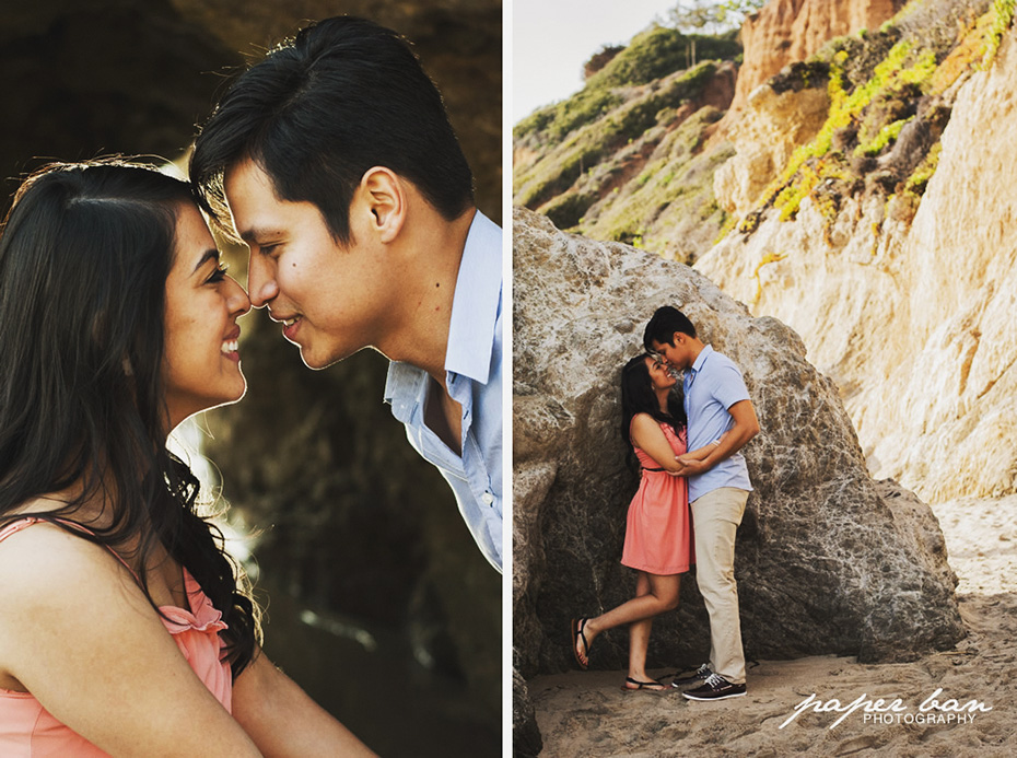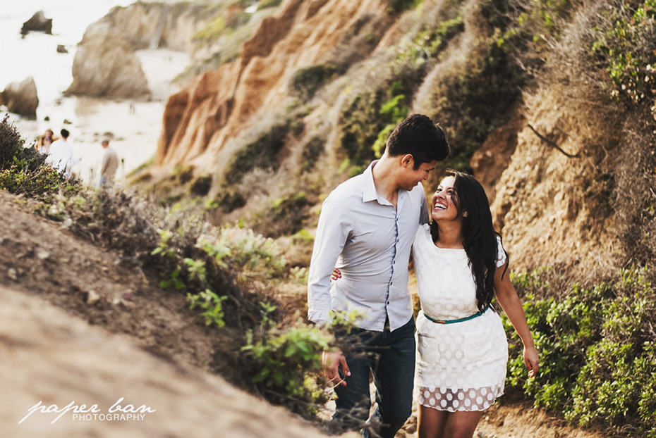 For a couple who thinks they don’t photograph well, Dee and Jonathan look amazing in these! We went to El Matador Beach in Malibu, which turned out to be a hot-spot for photographers. We soon understood why – the scenery was breathtaking. Huge cliffs met the sandy beach, with various sized rocks scattered on the shore.